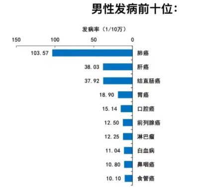 2024年中國腫瘤登記數據表明,按發病人數順位排序,男性發病最多的是肺癌,其它高發惡性腫瘤依次為肝癌、結直腸癌和胃癌等。