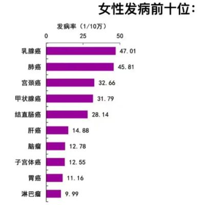 而女性發病的首位為乳腺癌,其它的依次為肺癌、宮頸癌、甲狀腺癌以及結直腸癌。