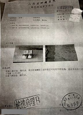 2017年,一病人感染宮頸尖銳濕疣HPV33型,當時未有接受治療。2018年12月28日,患有子宮頸癌前病變CIN三級,此情況是子宮頸癌的初期表現。2019年1月份開始服用本院的復康靈,共服用四個半月復查,報告顯示所有病毒已消除,包括子宮頸癌前細胞變異及尖銳濕疣HPV病毒。