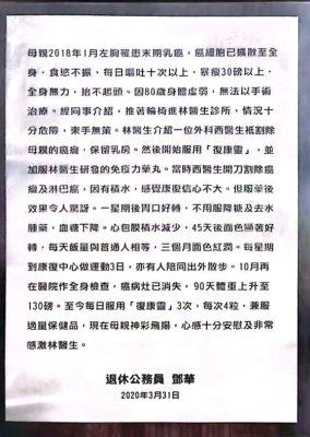 <林淦生®復康靈>有別於其他藥物,它是以增強自身的免疫力去對抗腫瘤,並且已治愈多位病患。