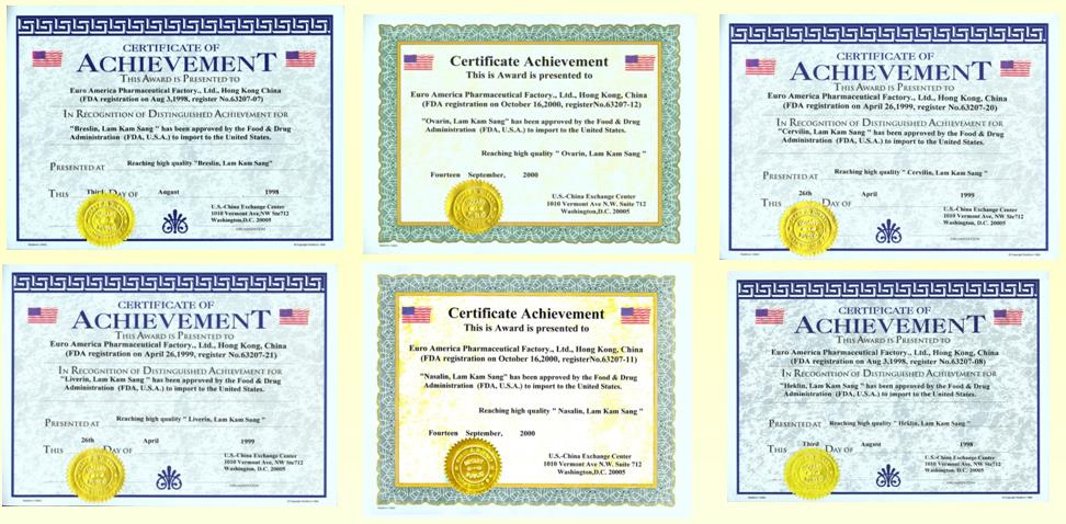• 「林淦生活腦素」、「林淦生乳康靈」、「林淦生維肝康」、「林淦生巢必康」、「林淦生鼻敏清」及「林淦生頸速康」獲得美國食品及藥物管理局「FDA」認證。