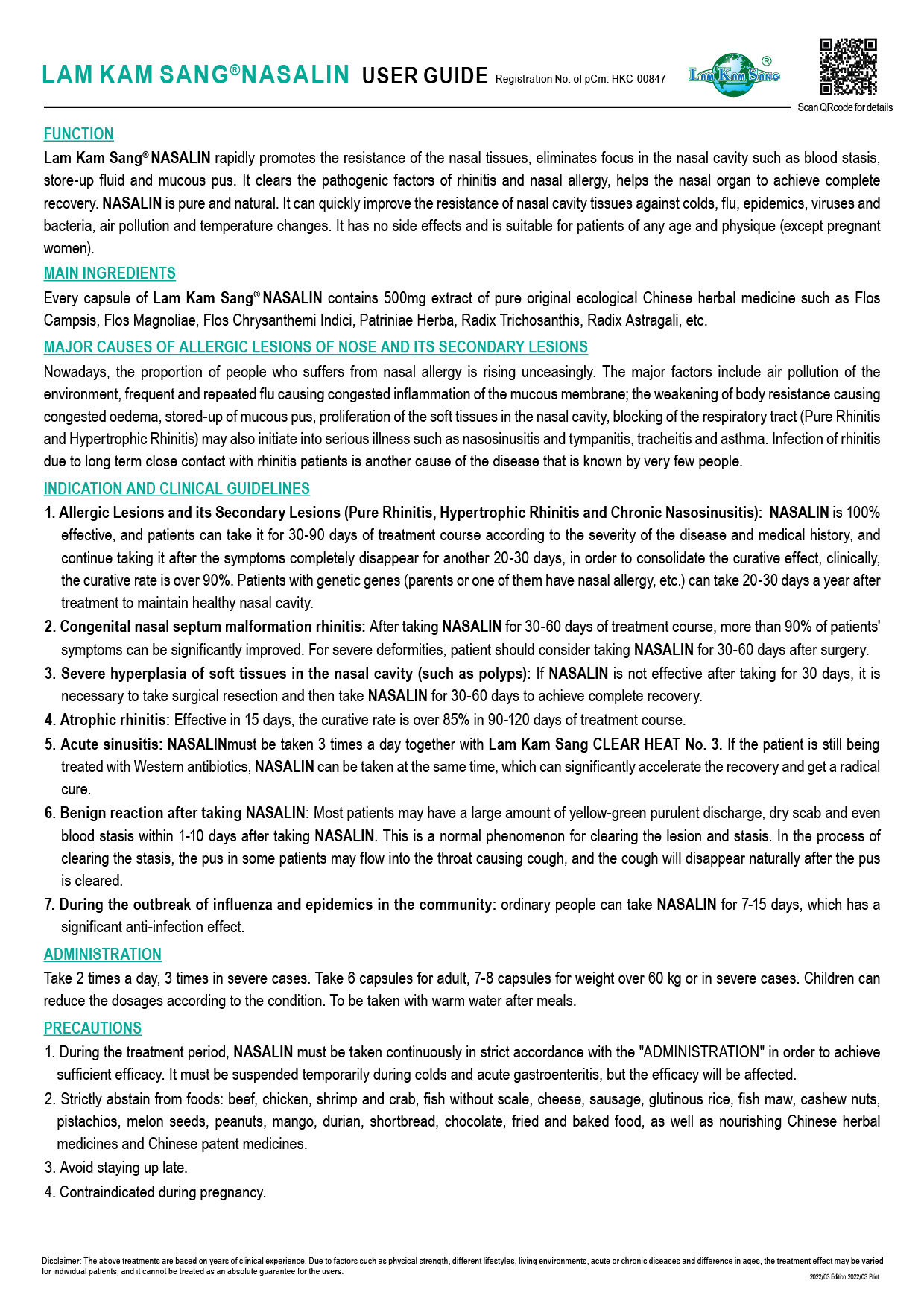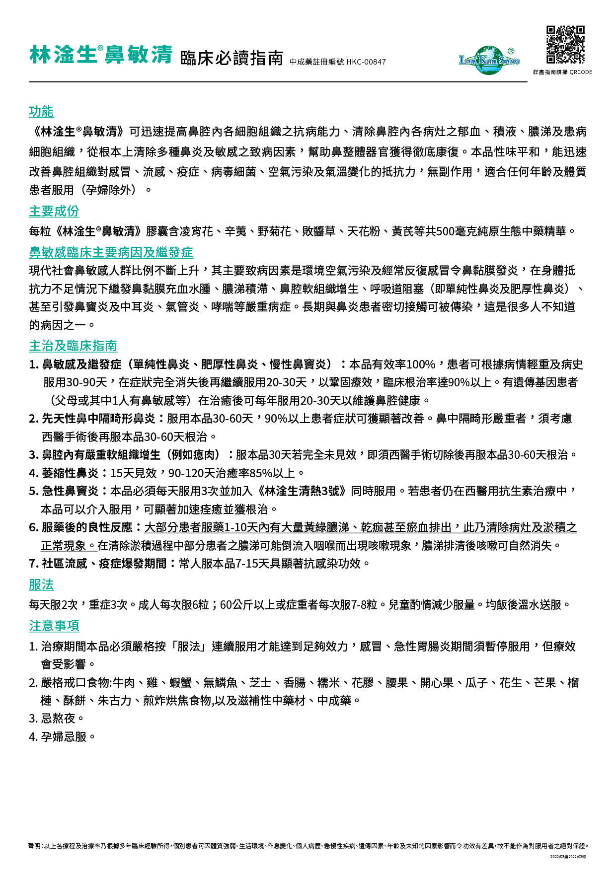 林淦生®鼻敏清臨床指南 中成藥註冊編號 HKC-00847