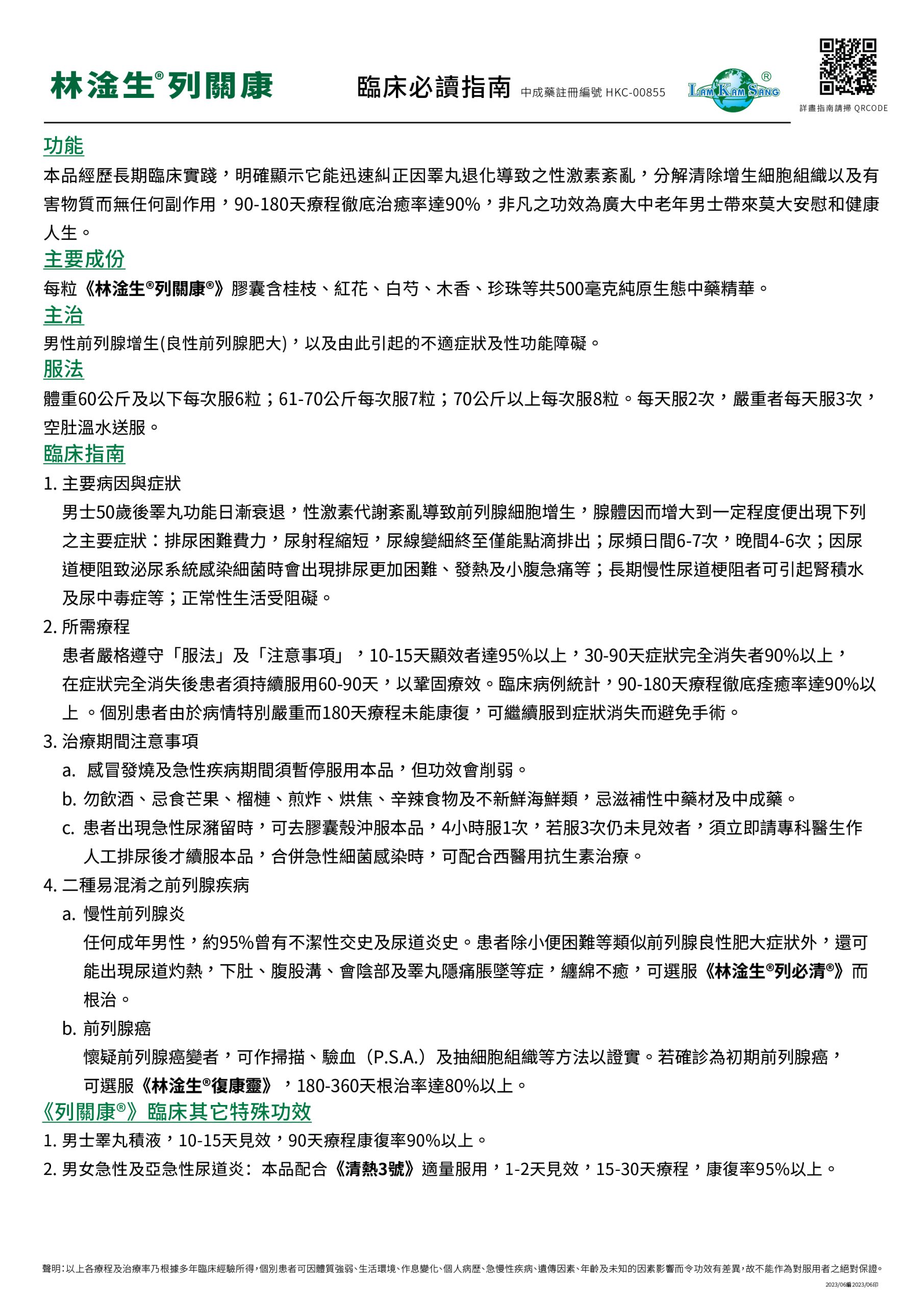 林淦生®列關康®臨床指南 中成藥註冊編號 HKC-00855