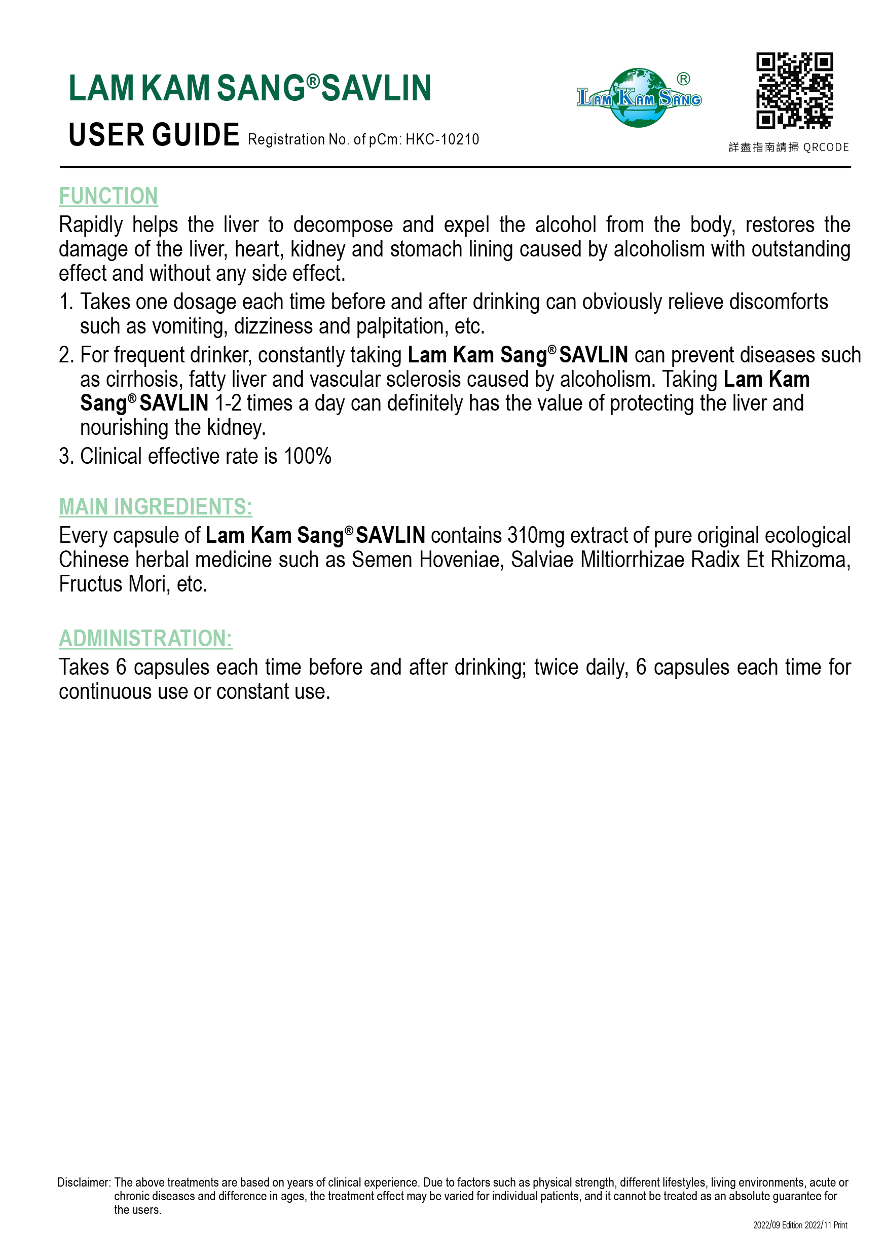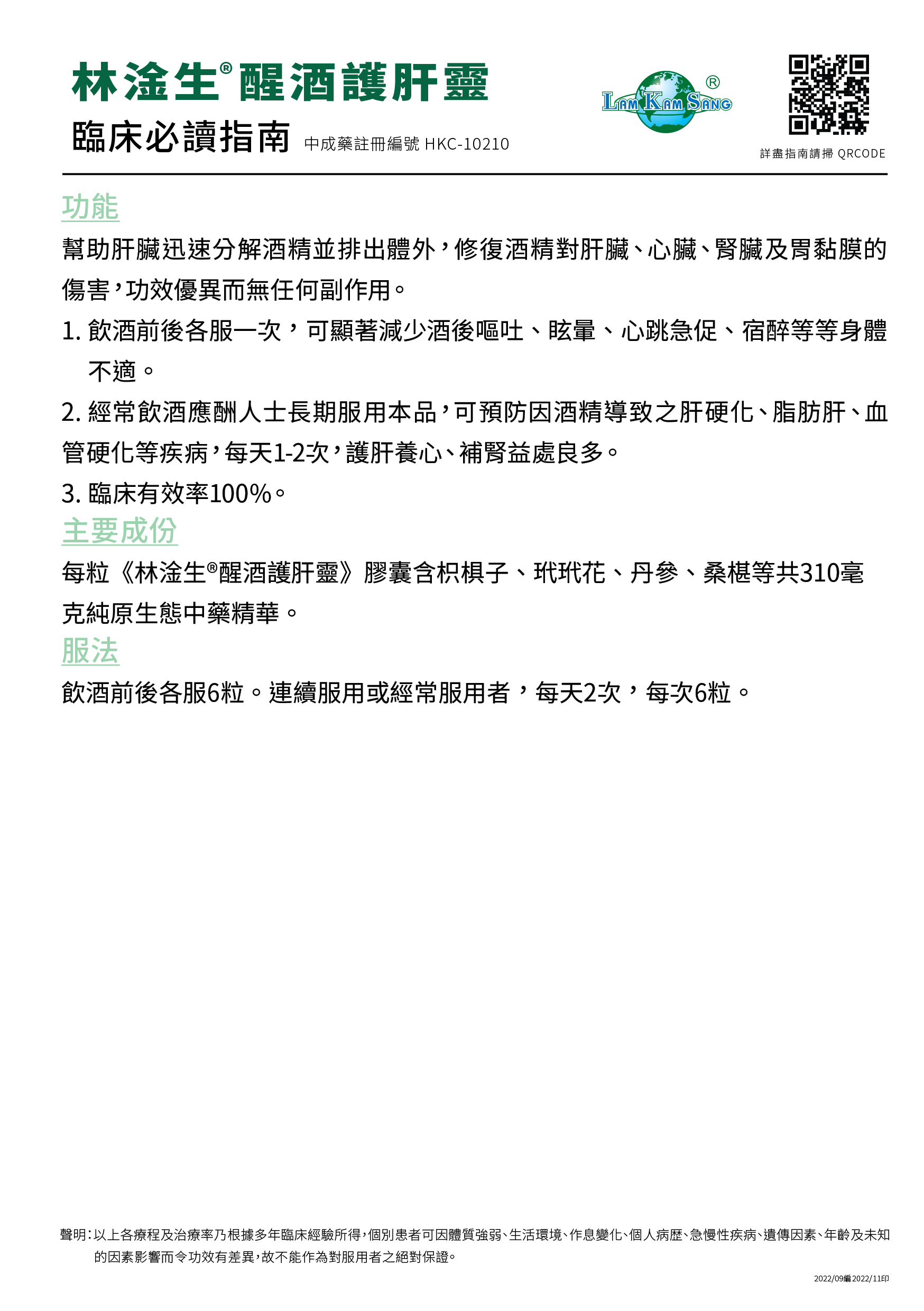 林淦生®醒酒護肝靈臨床指南 中成藥註冊編號HKC-10210